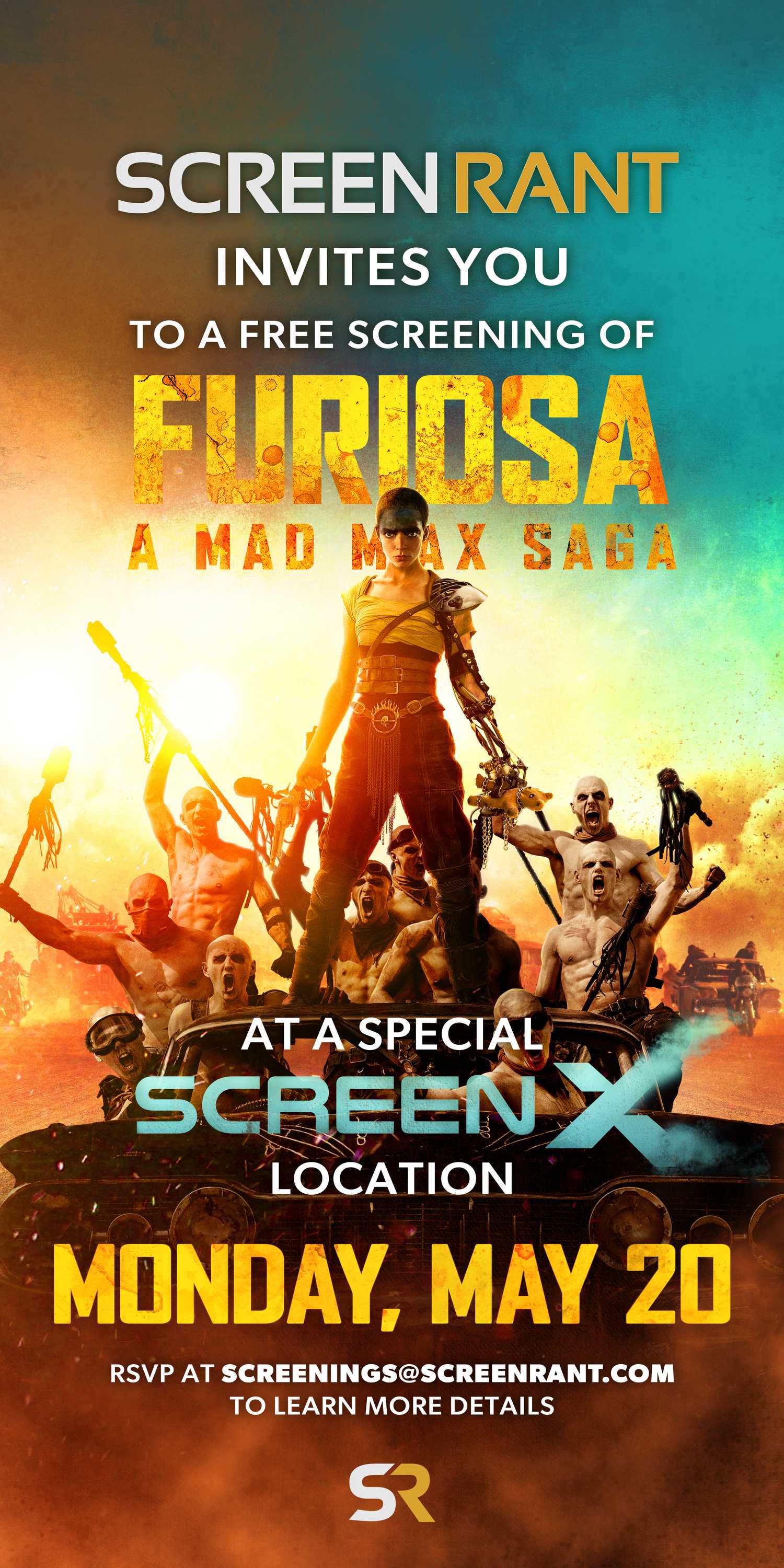 se complace en organizar una proyección ScreenX solo por invitación de Furiosa: A Mad Max Saga En los angeles. La proyección tendrá lugar el lunes 20 de mayo, donde los invitados podrán disfrutar de la experiencia de visualización panorámica de 270 grados y tres paredes de este formato único. Prepárese para ver la última obra maestra de Miller delante del público en general con concesiones gratuitas en contactando a screenings@.com para confirmar su asistenciay dejando saber si desea traer un invitado.