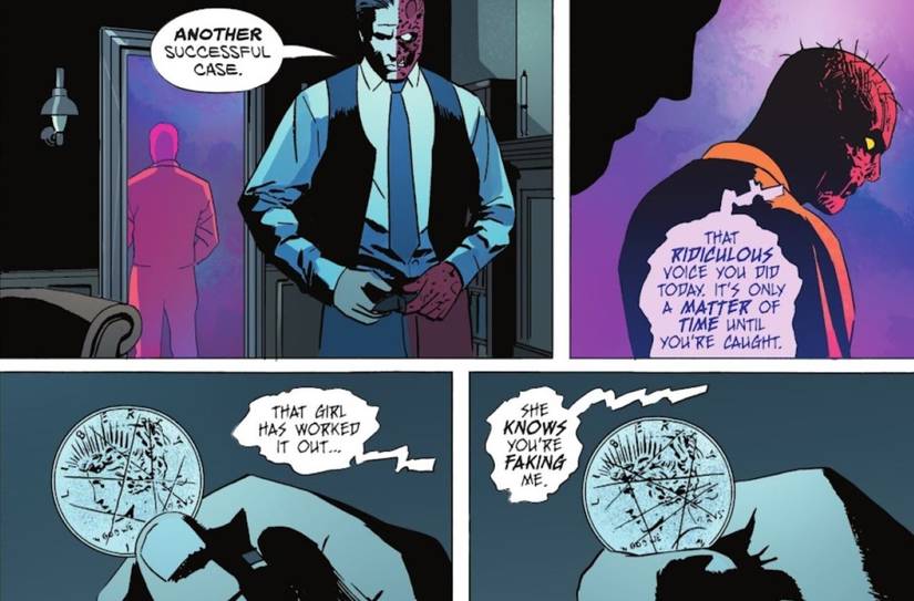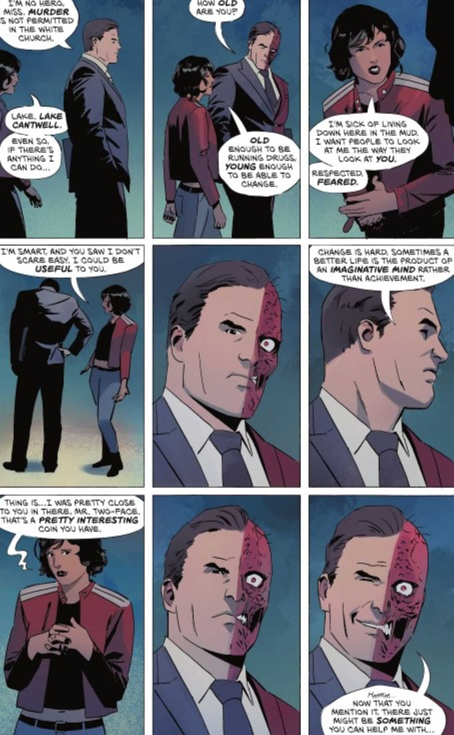 A pesar del despido inicial de Harvey, Lake se niega a darse por vencida y saca su carta de triunfo, dando a entender que conoce el secreto de Harvey: está fingiendo la presencia de su “mala mitad”. Como descubrirán más tarde los lectores, Harvey ha aprisionado mentalmente su lado más oscuro, pero continúa actuando como si todavía tuviera el control. Esta farsa le ayuda a mantener su credibilidad callejera dentro del inframundo criminal de Gotham mientras persigue en secreto su ambición de recuperar su puesto como fiscal de distrito de Gotham. Ante el chantaje implícito de Lake, Harvey acepta a regañadientes dejar que ella lo ayude.—Un momento crucial, ya que marca que Two-Face se enfrenta a su primer compañero.