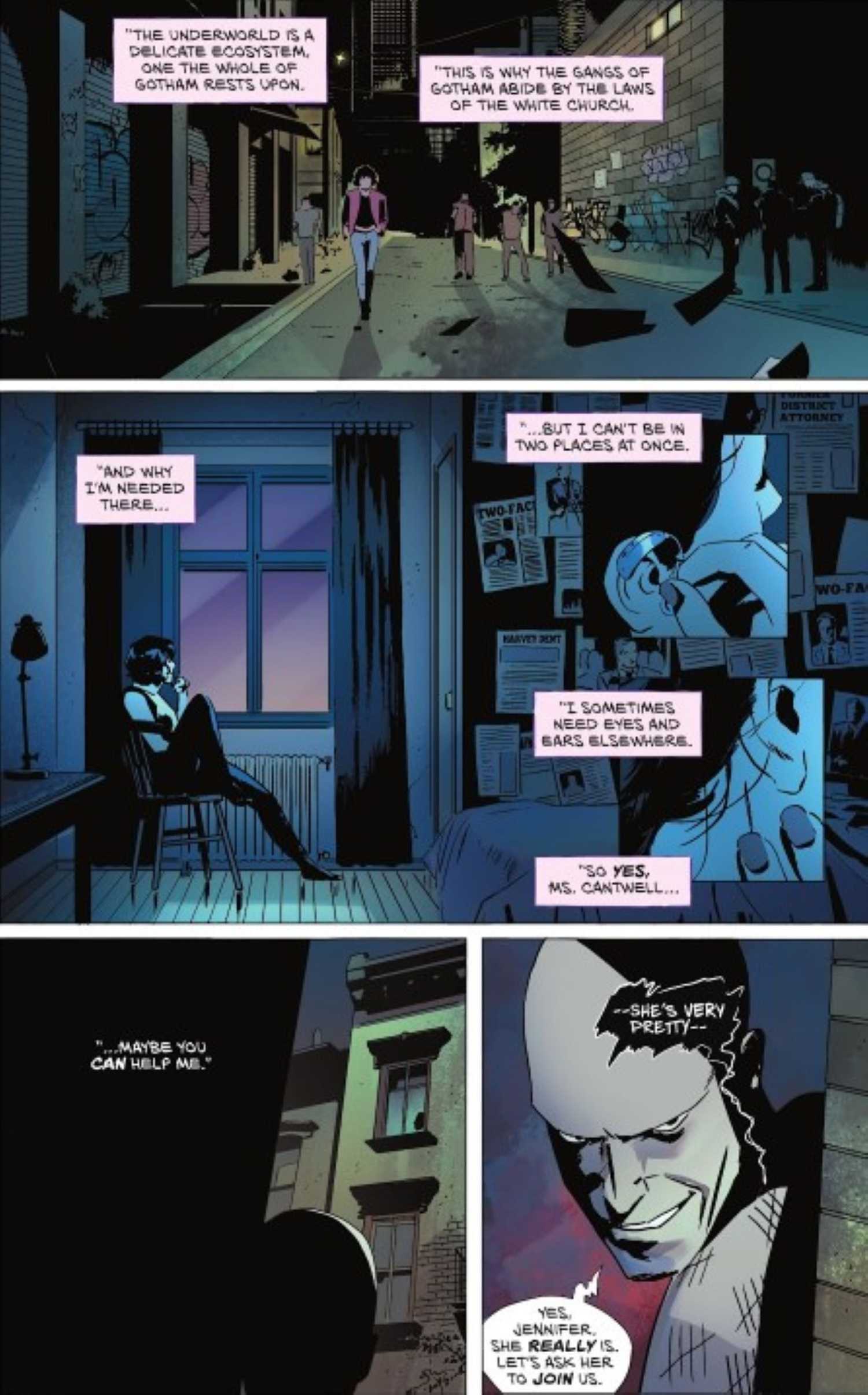 Si bien Lake aún tiene que adoptar un apodo peculiar o ponerse un disfraz de colores brillantes, Two-Face insinúa su primera misión: convertirse en sus ojos y oídos. Como explica el monólogo de Harvey, el inframundo de Gotham opera como un “ecosistema delicado” uno que influye en toda la ciudad. Este delicado equilibrio es la razón por la que las pandillas y los criminales respetan las leyes de la Iglesia Blanca y por la que es fundamental que Two-Face esté presente e involucrado en sus operaciones. Sin embargo, su compromiso con la Iglesia Blanca lo aleja de sus otras actividades, ya que ni siquiera Dos Caras puede estar en dos lugares a la vez.
