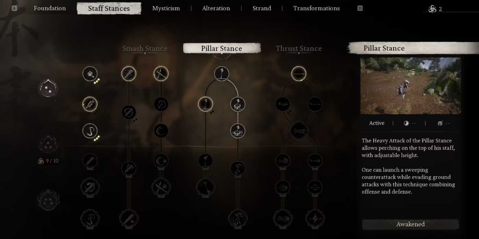 Al cargar un ataque pesado en Postura del Pilar, El Destinado se posará sobre su bastón.desatando un ataque aplastante cuando se suelta el botón. A medida que aumenta la concentración, también lo hace la longitud del bastón. Esto enviará a los jugadores a mayor altura en el aire, lo que les facilitará evitar ataques mientras cargan concentración y le dará a su ataque final más alcance. Los jugadores deberán tener cuidado al posarse, ya que los enemigos pueden derribarlos de su pilar.
