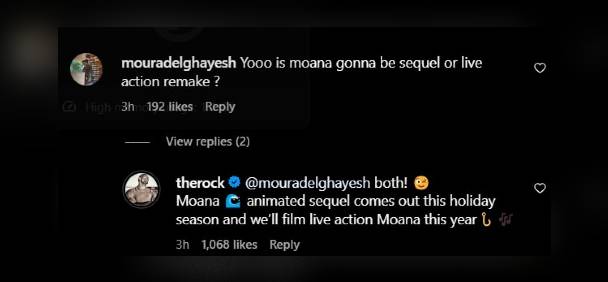 “La secuela animada de Moana sale en estas temporadas navideñas y filmaremos Moana en vivo este año.“, escribe Johnson en su respuesta.