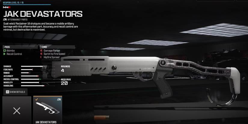Debido a preocupaciones sobre el equilibrio de armas, las armas Akimbo en MW3 Naturalmente, no permita muchas variaciones de apego. Este caso no es diferente para los JAK Devastators, como se ve en el video de WhosImmortal. Barriles, subbarriles, ópticas y culatas no se puede modificar. Con los accesorios personalizables restantes, concéntrate en ajustar la dispersión de la bala para aumentar la precisión del disparo desde la cadera. Estas escopetas luchan a distancia, por lo que maximizar el impacto de el daño a corta distancia con accesorios es primordial.