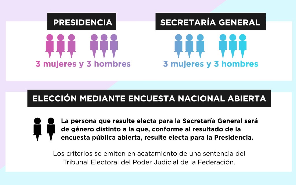 Para garantizar que las mujeres y los hombres militantes participen en igualdad de condiciones, las listas de candidaturas a la presidencia y la secretaría general que participarán en la encuesta pública de reconocimiento -de cuyos resultados se extraerá un máximo de seis opciones de votación por cada cargo para la realización de la encuesta pública abierta-, deberán integrarse por igual número de mujeres y de hombres. Es decir, se conformarán por tres candidatas y tres candidatos a la presidencia y por tres candidatas y tres candidatos a la secretaría general.