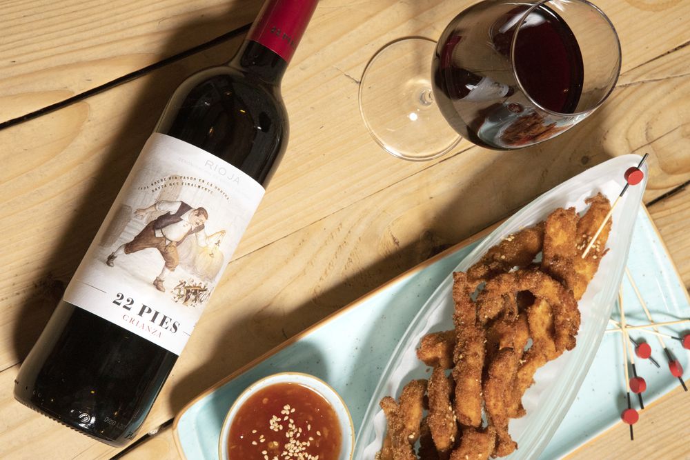 La tradición española del tapeo es un clásico y ya se sabe que “si algo funciona, mejor no lo toques”, pero también es verdad que los tiempos cambian y la forma de cocinar también. Eso pasa en el malasañero bar Amor, donde preparan unos fingers de pollo viajados, con un pie en el Mediterráneo y otro en Asia. “La clave es el aliño que preparamos para marinar la carne. Ponemos curry, ajo, pimentón, canela y cacahuete triturado”, nos explican. El resultado es el pollo rebozado y frito que nos pirra desde pequeños, pero con un punch de sabor que anima cualquier reunión y que se lleva a las mil maravillas con 22 pies, gracias a la versatilidad de este Rioja moderno.