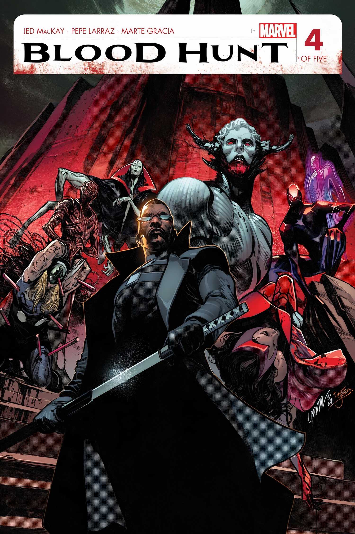 caza de sangre El número 4 está escrito por Jed MacKay y dibujado por Pepe Larraz. Los vampiros, liderados por Varnae, que ha poseído a Blade, están preparando su final, cuando de repente aparece la luna en el cielo. De la nada surge la voz de Khonsu, que dice “en la oscuridad… luz”.