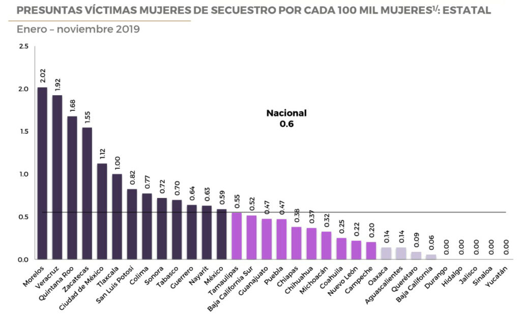 De enero a noviembre de 2019, en Morelos fueron secuestradas 21 mujeres, lo que colocó a la entidad en el cuarto lugar nacional, solo detrás de Veracruz, Ciudad de México y el Estado de México.