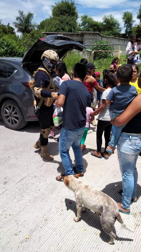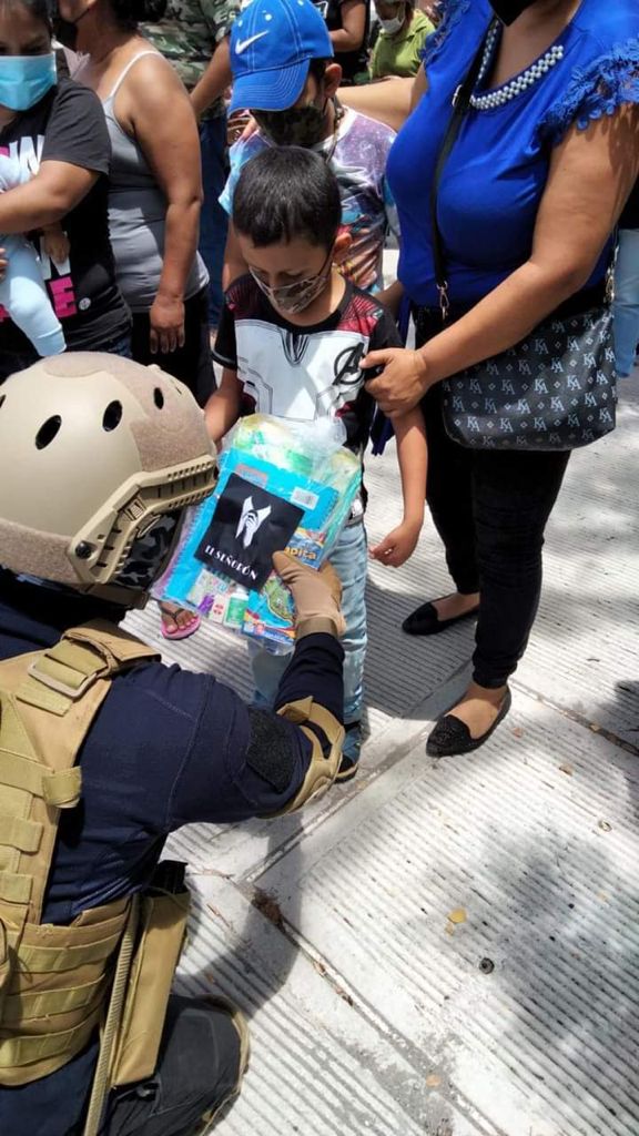 En redes sociales difundieron fotografías donde se observa a hombres vestidos con equipo táctico y armas de grueso calibre repartiendo a mujeres y niños de escasos recursos juguetes, útiles escolares y despensas empaquetados con la leyenda “El Señorón”.