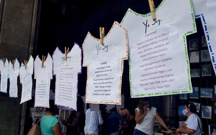 Con un tendedero de playeras con la frase “Yo soy”, familiares de desaparecidos en Morelos visibilizaron las características y artículos que portaban las personas que por años estuvieron en calidad de desconocidas en las Semefos de Morelos y cuyos cuerpos fueron inhumados recientemente para darles un resguardo digno.