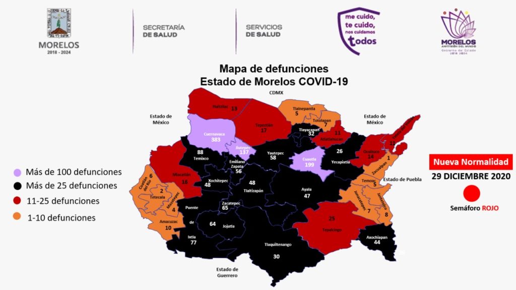 Los municipios con mayor incidencia de casos son Cuernavaca, Jantetelco, Jiutepec, Jojutla y Jonacatepec, por lo que el gobierno del estado llamó a los habitantes de dichas demarcaciones a extremar las medidas de seguridad sanitaria con la finalidad de cortar la cadena de contagio.