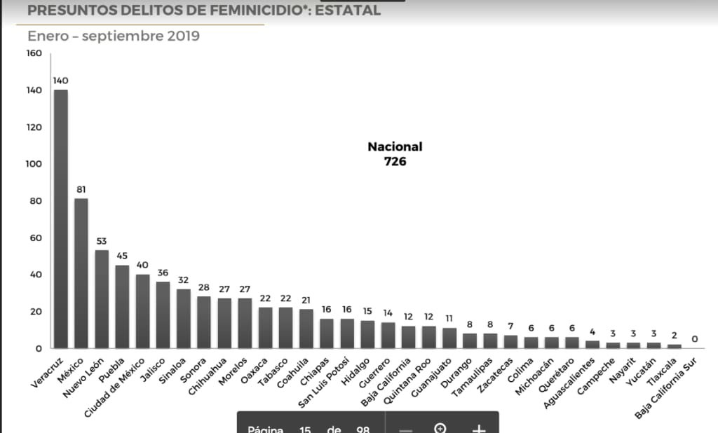 Cuernavaca, Morelos. De acuerdo con las cifras del Secretariado Ejecutivo del Sistema Nacional de Seguridad Pública (SESNSP), de la Secretaría de Gobernación, en septiembre de 2019 Morelos se colocó como el segundo estado del país con más feminicidios y el cuarto con más homicidios dolosos.