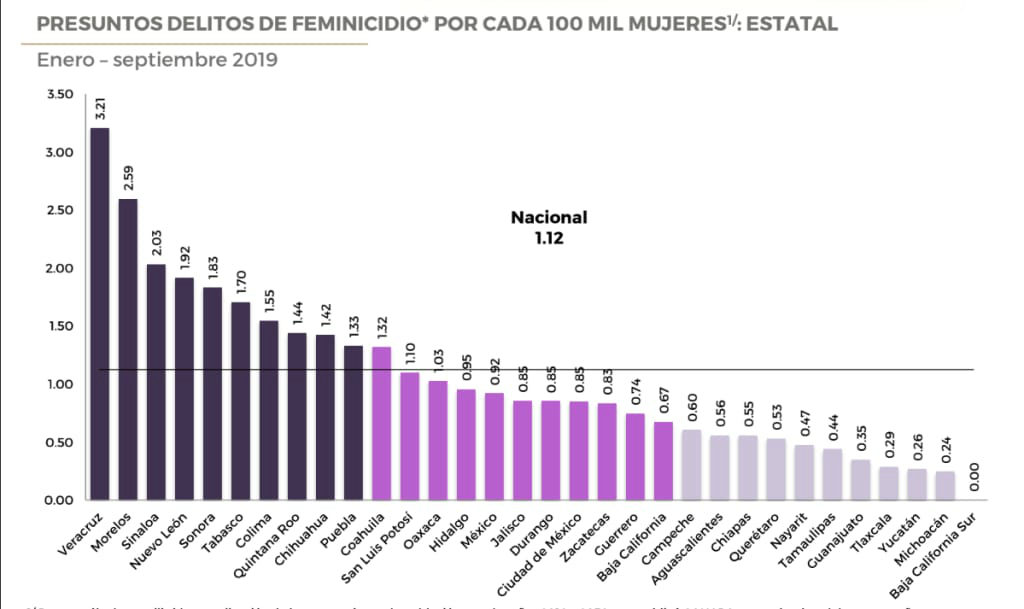 A septiembre de este año la tasa era de 2.59 feminicidios por cada 100 mil habitantes, mientras que la tasa nacional era de 1.12.