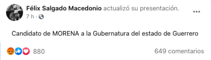 Minutos después de la media noche, Salgado Macedonio publicó en sus redes sociales que ya era candidato de Morena por el estado de Guerrero. “¡Viva Guerrero! ¡Hay Toro!”, señaló en Twitter.