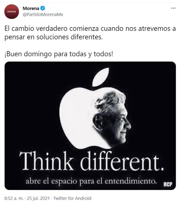 La cuenta de Twitter del Movimiento de Regeneración Nacional (Morena) subió la mañana de este domingo un tuit que emulaba la histórica campaña de la empresa Apple ‘Think different’ (‘Piensa diferente’ en español), creada en 1997.