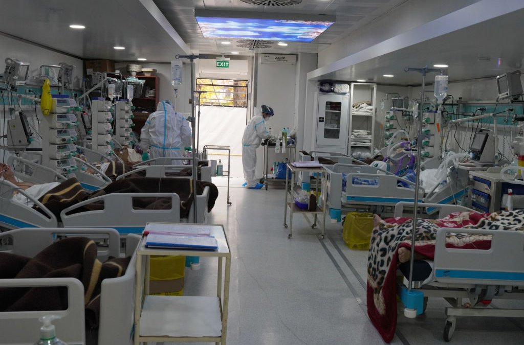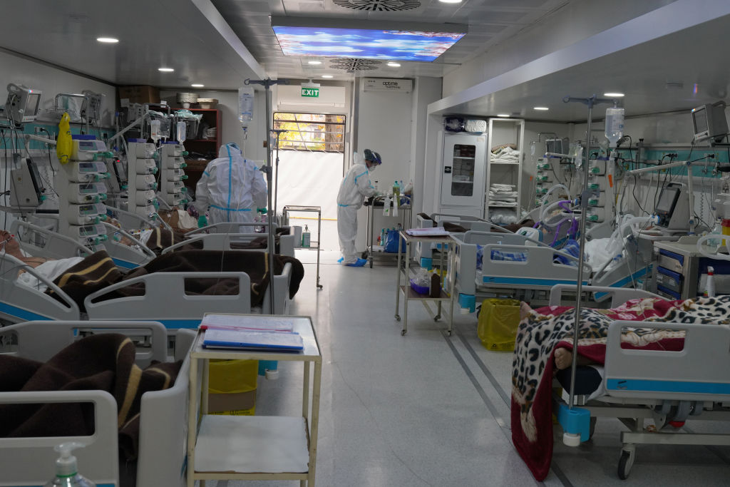 En el principal hospital en Bucarest, los cuerpos de fallecidos por COVID-19 se colocaban en un pasillo en días recientes porque no había espacio en la morgue. En una sala de espera se instaló una lona de plástico para convertir parte del espacio en en unidad de urgencias.