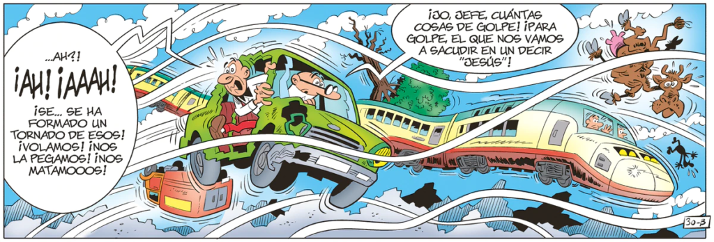 El tebeo El cambio climático es un clásico Ibáñez: porrazos, disfraces, catástrofes… En su álbum número 211, Mortadelo y Filemón reciben como encargo probar diferentes inventos del profesor Bacterio contra la crisis climática. No hace falta decir que todos resultan un fracaso y los dos agentes de la TIA acaban siempre por ser linchados. Lo interesante es que recorren todos los frentes de la crisis global: calor, fenómenos climáticos extremos, inundaciones… Todo ello contado en el clásico lenguaje de Ibáñez: “Han de seguir con el asunto del cambio climático”, les explica el Súper. “En Valdeseca del Secarral llovió por última vez cuando pasó por allí Amalrico el rey Godo”.
