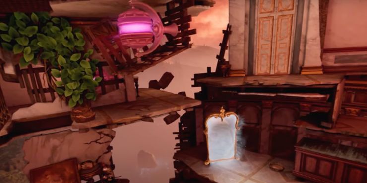 Para continuar completando este capítulo en Musgo: Libro 2, los jugadores pueden cruzar el espacio a la derecha para alcanzar el espejo, pero no es necesario que lo atraviesen todavía. En su lugar, Quill puede trepar a la repisa frente a la puerta y saltar al área con las enredaderas. El Lector necesita sacar el bloque para que Quill pueda lanzarle su Chakram cargado. A continuación, el Lector puede empujar el bloque hacia atrás Musgo: Libro 2, entonces Quill puede ir detrás de la pared para alinear el Chakram cargado. Recuperar el arma romperá el orbe dentro del edificio en ruinas. Esto permitirá que Quill atraviese el espejo y salte sobre el bloque que aún está empujado.