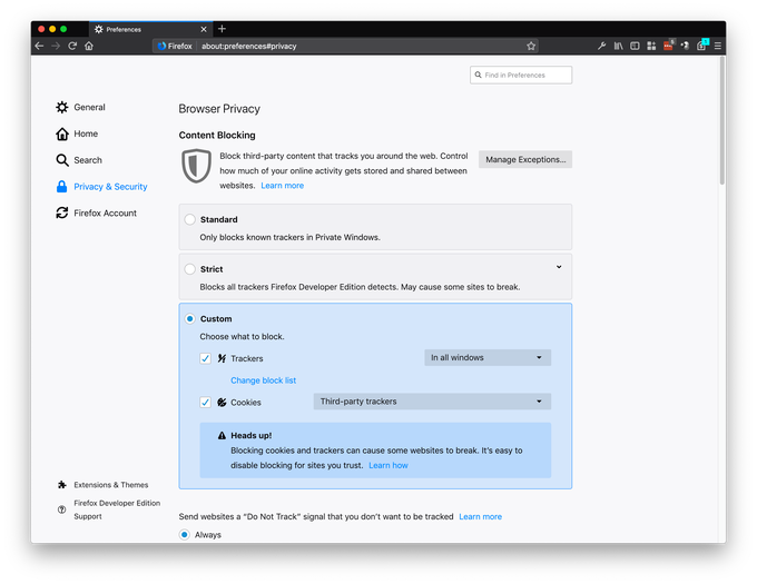 En las cookies, la opción personalizada también permite a los usuarios elegir bloquear los rastreadores de terceros; cookies de sitios web no visitados; todas las cookies de terceros (que Mozilla advierte "puede" hacer que los sitios web se rompan); y todas las cookies (lo que dice hará que los sitios web se rompan).