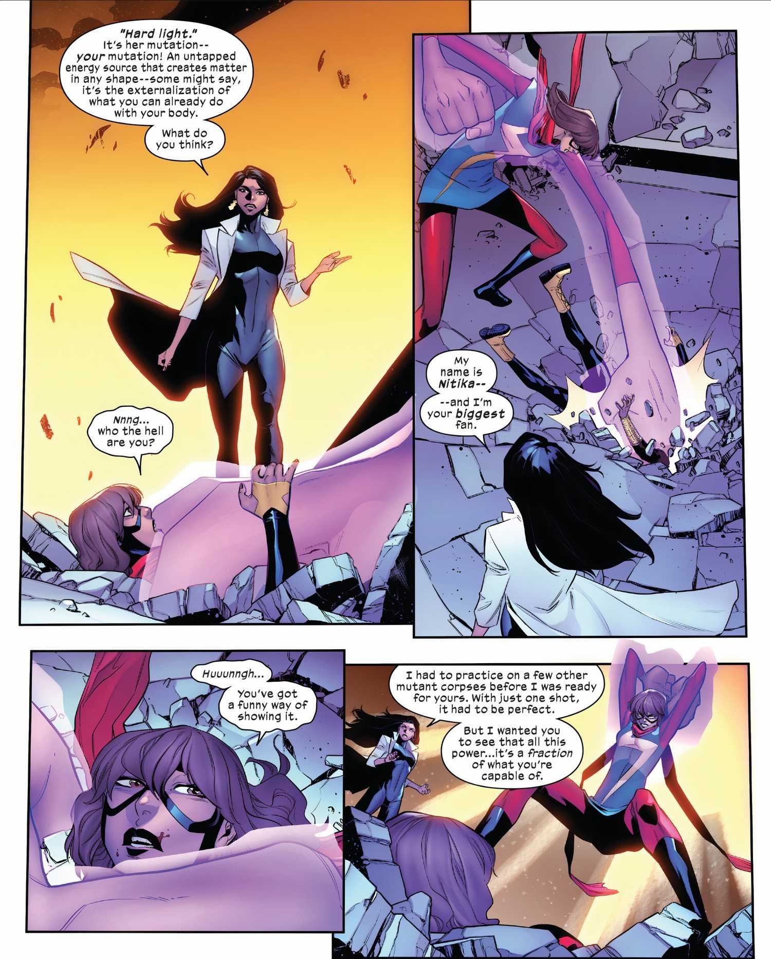 Iman Vellani, Sabir Pirzada, Scott Godlewski y Erick Arciniega Sra. Marvel: Amenaza mutante El número 4 se centra en gran medida en los temas de la identidad y lo que los poderes mutantes de la Sra. Marvel significan para ella a nivel personal. Antes de que Kamala pueda descubrirlos por sí misma, es emboscada por el ex agente de Orchis, Nikita Gaiha, quien asalta la mezquita de Kamala con el cadáver reanimado de Ms. Marvel antes del renacimiento.