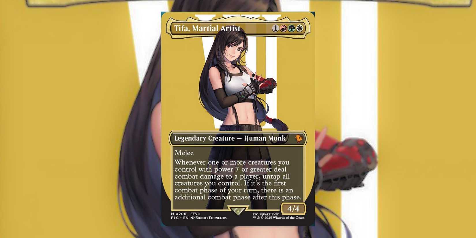 En comparación con la nube, ex soldado, TIFA es una tarjeta de criatura muy diferente, incluso si su enfoque principal también es combate. Con ella, su objetivo principal será declarar ataques contra todos sus oponentes por fase de combate para asegurarse de que obtenga un contador +1/ +1 hasta el final de su turno para cada oponente dirigido. Si estás jugando en un grupo de cuatro, TIFA podría obtener +3/ +3 durante cada fase de combate. A su vez, esto sinergia con su otra habilidad, lo que desencadena una Unftap en todas tus criaturas cuando una criatura con Power 7 o más trata el daño de combate.