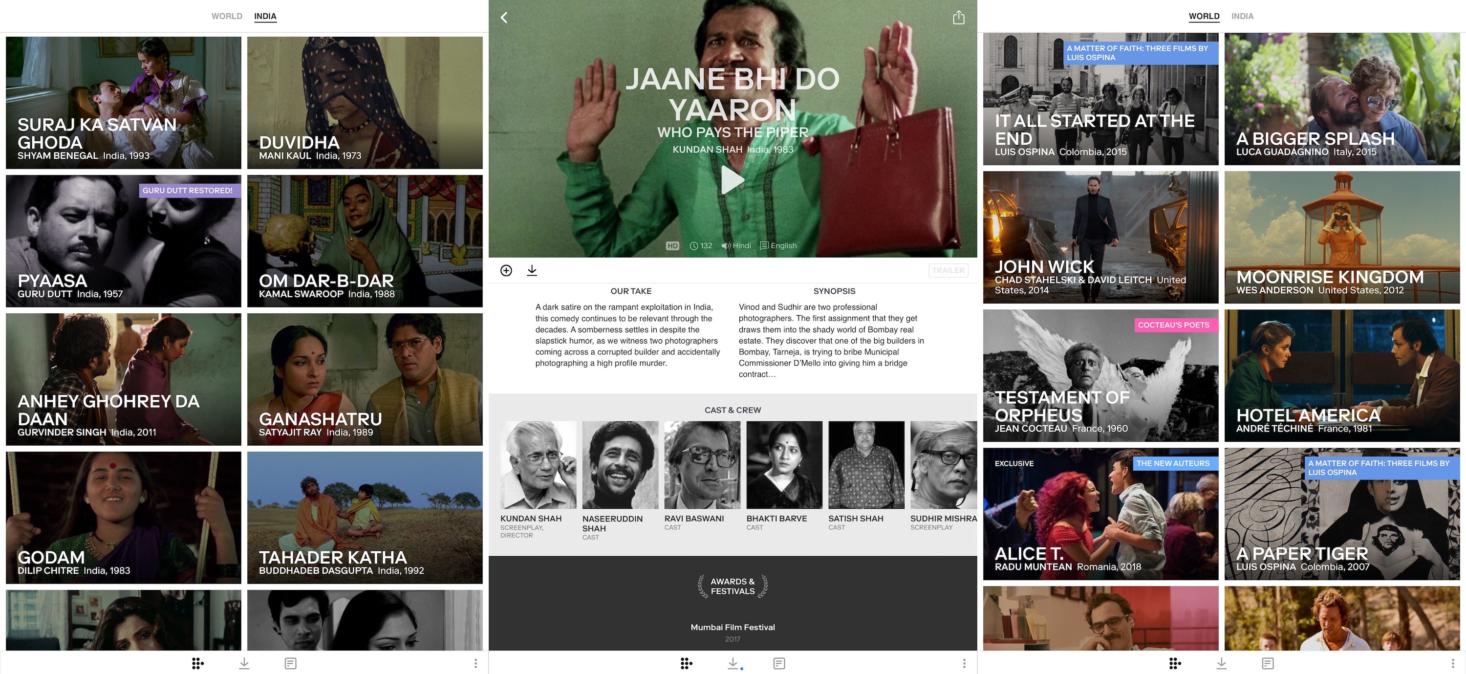La compañía ha asegurado acuerdos con los distribuidores locales FilmKaravan, NFDC, PVR Pictures, Shemaroo y Ultra para poblar títulos en la sección de India todos los días. Algunos de los próximos títulos incluyen la película de culto de Kamal Swaroop Om Dar-B-DarDe Kanu Behl Binnu Ka Sapna, que se estrenó en el Festival Internacional de Cortometrajes de Clermont-Ferrand este año, y película fantasma Duvidha del maestro de la casa de arte indio Mani Kaul.