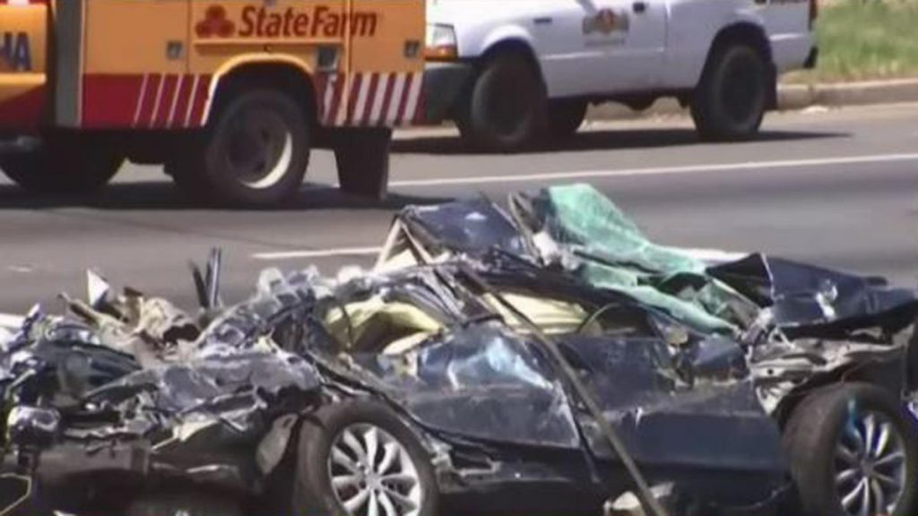 Video de la escena muestra un carro casi destrozado entre el autobús y el camión, cerca de una mediana cubierta de hierba. El camión se volcó mientras que el autobús sufrió daños en su parte frontal y en el lado del conductor.