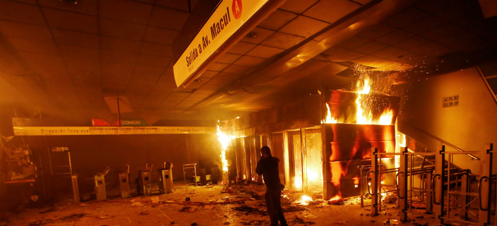 Las manifestaciones, en protesta contra el aumento de la tarifa del boleto de Metro, se tornaron violentas y se registraron graves desórdenes con incendios en varios puntos de Santiago, saqueos y actos vandálicos que sumieron a la capital del país en el caos.