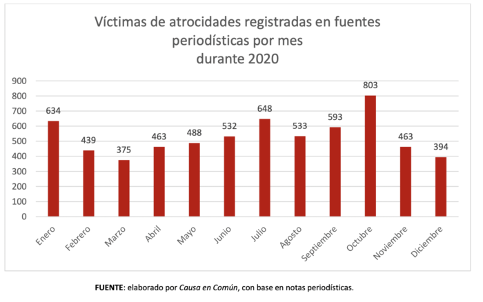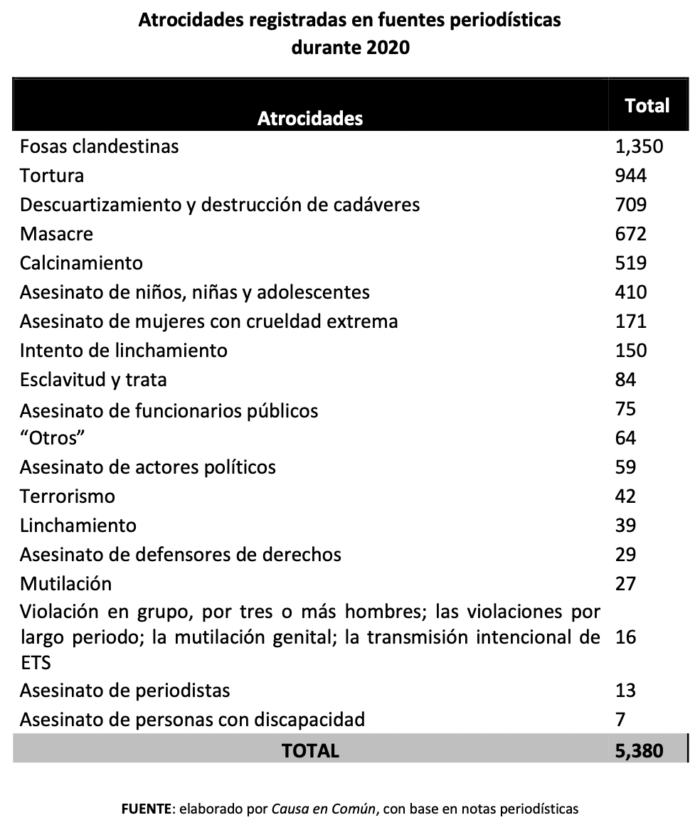 Masacres, fosas clandestinas, calcinamientos, fueron algunos de los eventos registrados como “atrocidades” ocurridas en 2020, que fueron registradas por la organización Causa en Común en un informe presentado ayer.