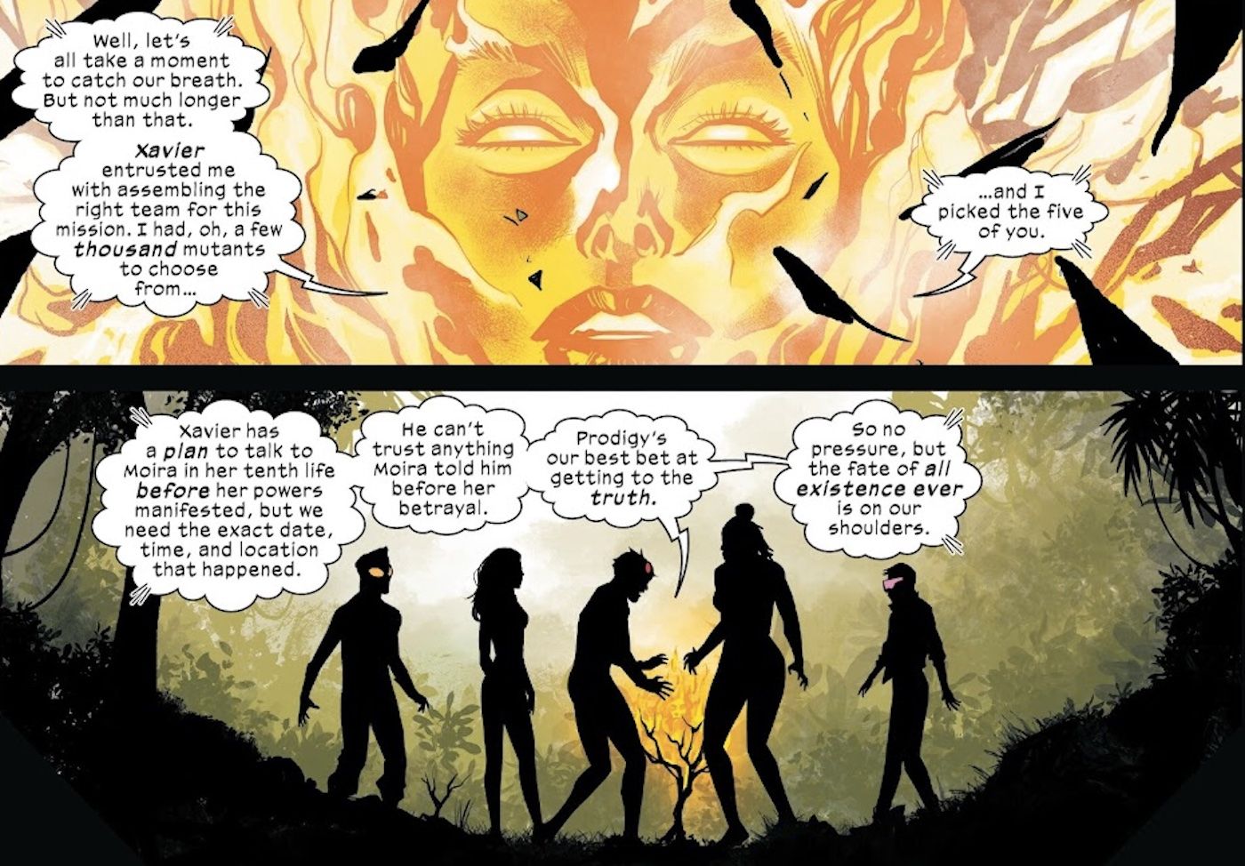 El Profesor X ha ideado un plan para prevenir este ataque y los acontecimientos de Caída de X que siguió nunca sucedió. Ese plan depende de que él viaje atrás en el tiempo y mate a Moira antes de que se manifiesten sus poderes de resurrección mutantes, evitando así que Krakoa se forme en primer lugar. Xavier hace que Rachel Gray resucite a los X-Men recién elegidos y los envíe a través de diferentes líneas de tiempo creadas por Mister Sinister durante el Pecados de siniestro evento, buscando una versión de Moira cuyos recuerdos Prodigy pueda absorber. Moira tiene defensas psíquicas que han protegido sus pensamientos de Xavier y Emma Frost, pero Rachel cree que debido a que la absorción psíquica de Prodigy es pasiva, es posible que no esté preparada para ello.