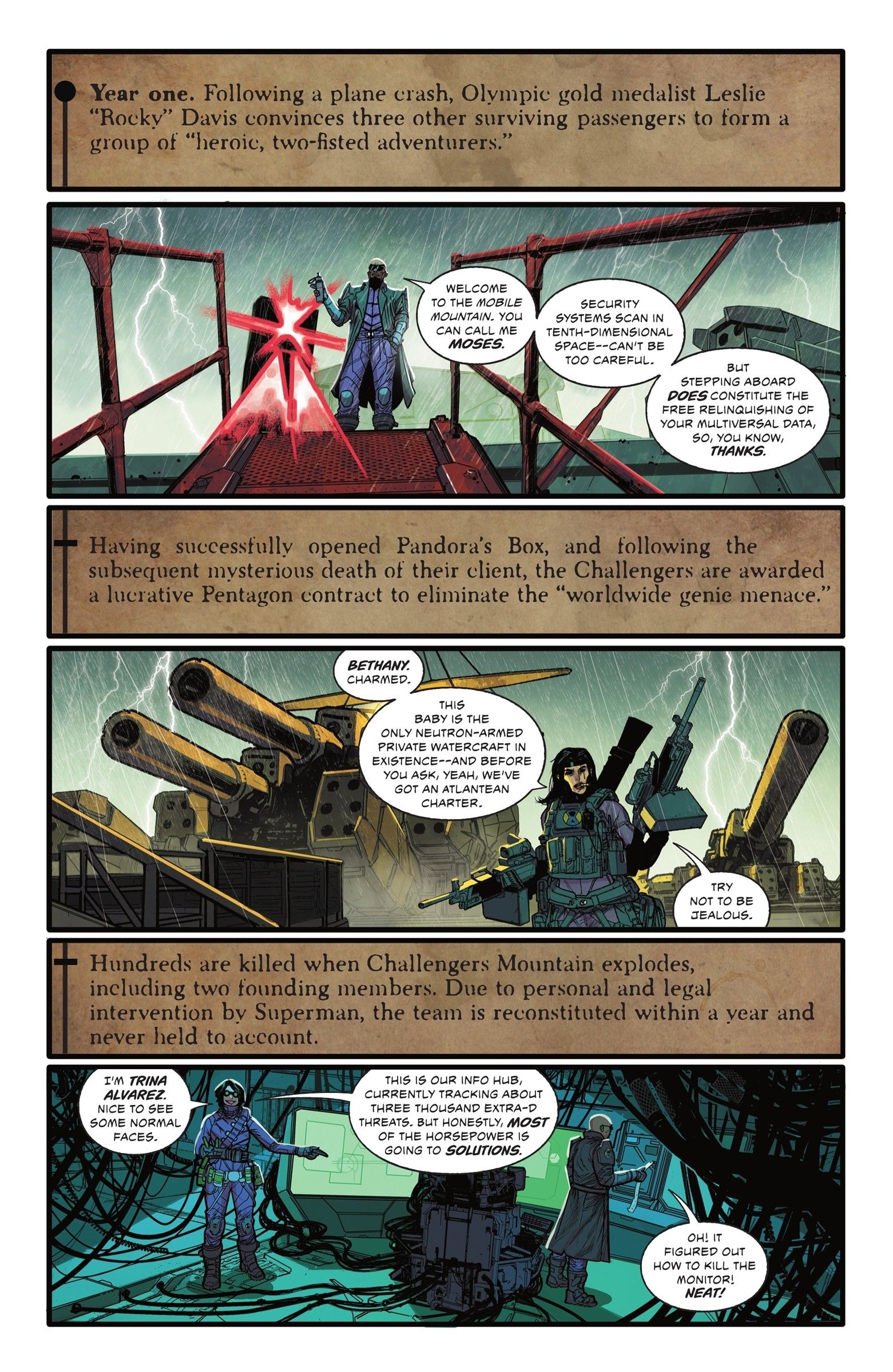Forasteros El número 2 está escrito por Jackson Lanzing y Collin Kelly y dibujado por Robert Carey. La encarnación más reciente de los Forasteros se ha enfrentado a los Desafiadores de lo Desconocido en aguas internacionales. Los Challengers llevan a los Outsiders a un recorrido por la versión móvil de Challengers Mountain. El equipo es llevado al centro de información de Mountain, que actualmente está rastreando miles de amenazas extradimensionales.