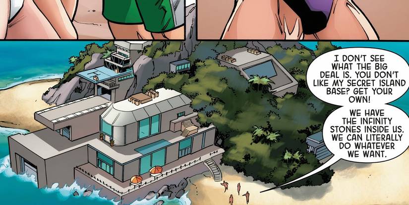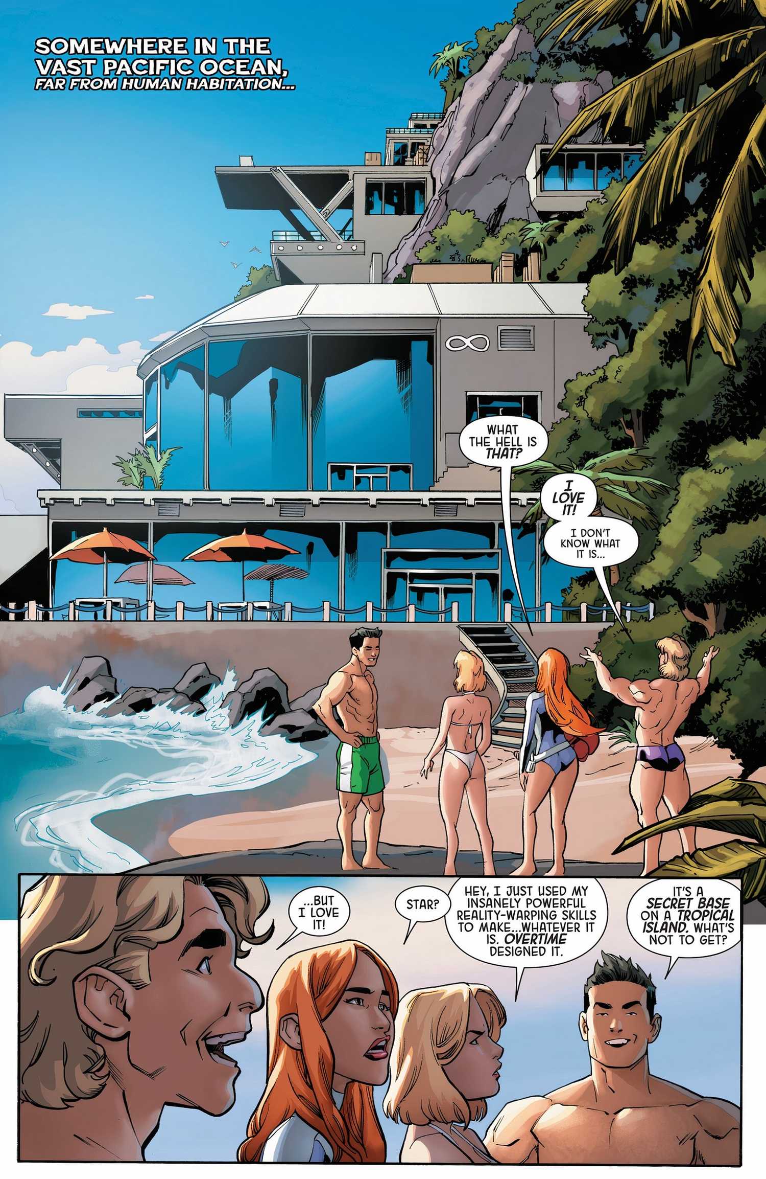 Visto en todo su esplendor en la primera página de este número, el nuevo hogar de Infinity Watch fue conjurado por Star, el miembro de Infinity Watch impulsado por Reality Stone, con su diseño tipo resort de playa ideado por otro miembro de Infinity Watch, Time. Horas extras con piedras. Ubicado “En algún lugar del vasto Océano Pacífico, lejos de la habitación humana…” Esta sede de superhéroes infinitamente genial es esencialmente una casa de vacaciones en todo menos en el nombre.ya que no solo está construido en una isla, sino que también cuenta con comida y bebida, un helipuerto, un comedor en la azotea, un patio e incluso una mesa con el logotipo de infinito.