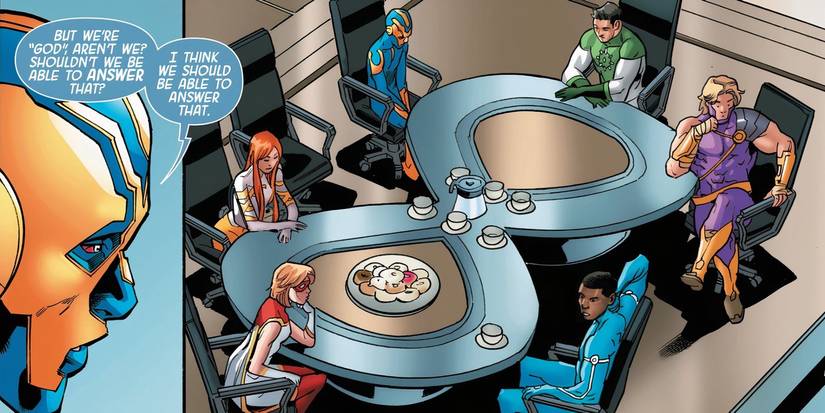 Pero ahora, en el primer número de El reloj infinito, El equipo de héroes mejorados con la Piedra del Infinito de Phil Coulson ha creado literalmente una base de la nada utilizando el poder de la Piedra de la Realidad.avergonzando al sofocante rascacielos que es la Torre de los Vengadores.