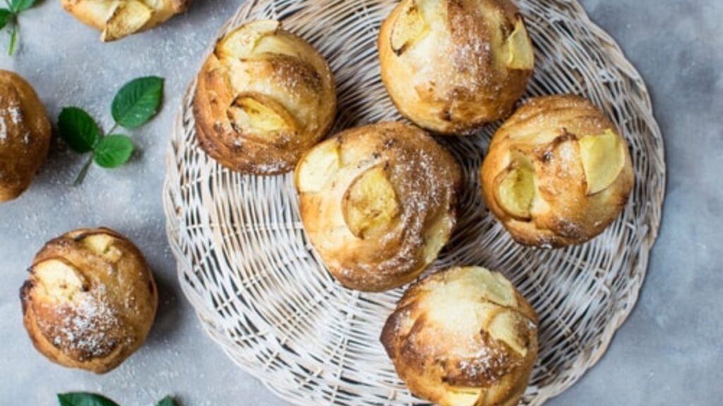 - Pelamos las manzanas y las troceamos, colocamos encima de cada uno de los muffins para darles el punto frutal que necesitarán.