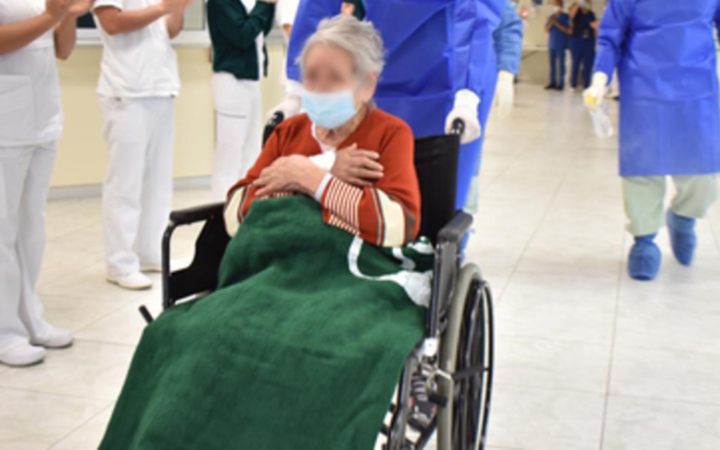 Al abandonar el hospital Santa Cecilia la paciente de 97 años recibió aplausos del personal médico, que bajo las normas de la sana distancia, formó una valla para despedirla y celebrar su recuperación.