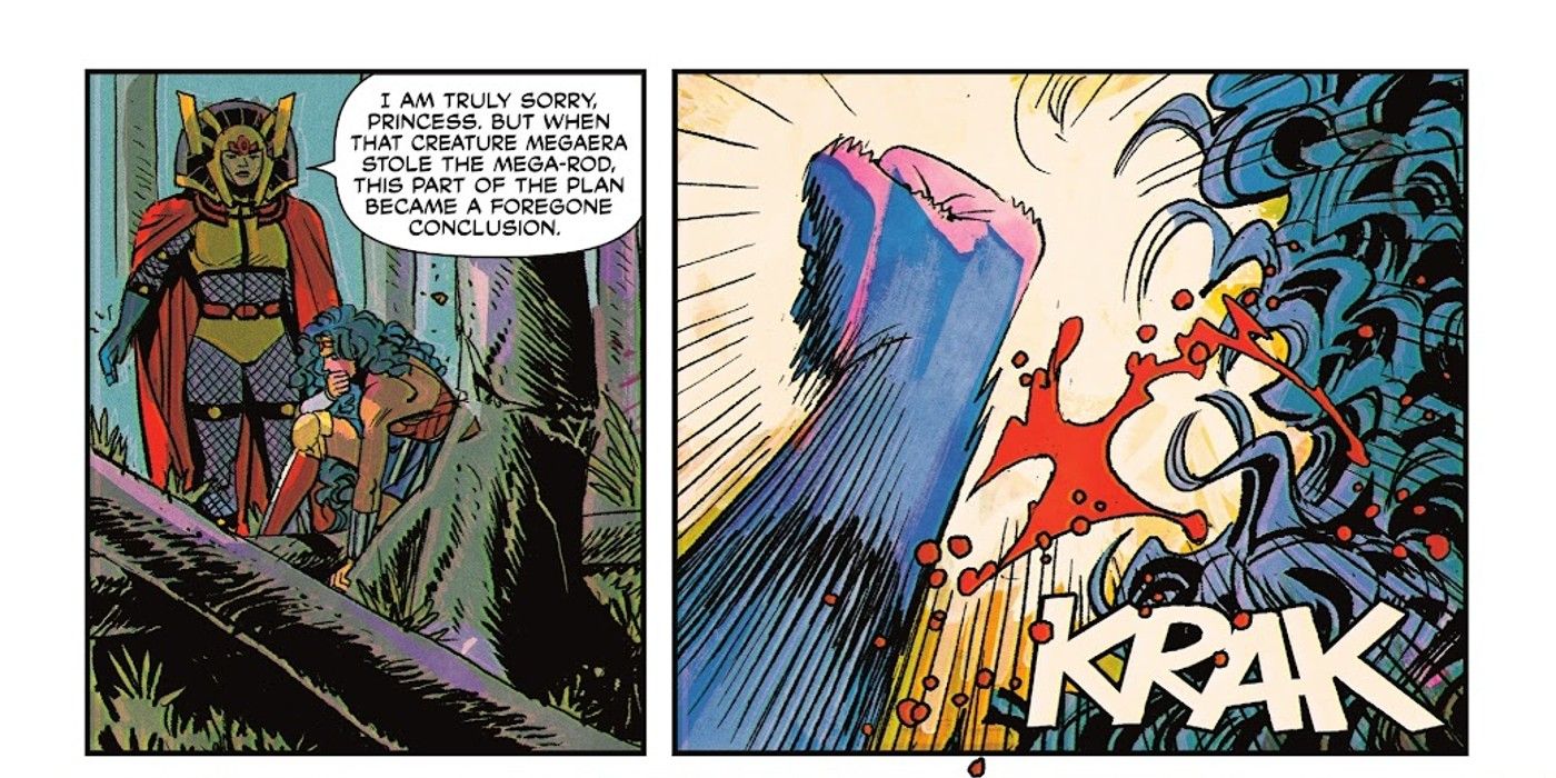 - Big Barda acepta el desafío y domina la pelea con Wonder Woman hasta que Diana le da un puñetazo masivo que cambia el rumbo.
