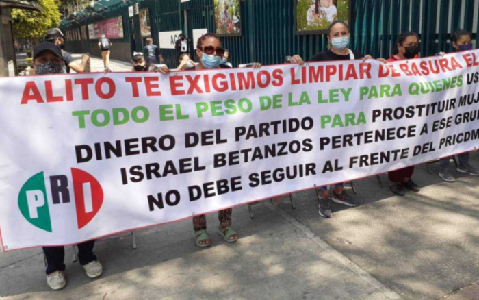 “Alito, te exigimos limpiar de basura al PRI CDMX, todo el peso de la Ley para quienes usaron dinero del partido para prostituir mujeres, Israel Betanzos forma parte de ese grupo, no debe seguir al frente del PRICDMX”, decía una de las mantas que utilizaron para bloquear momentáneamente la avenida Insurgentes.