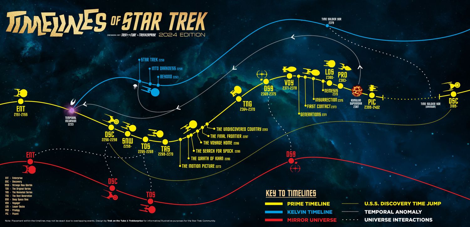 - Las líneas de tiempo de Star Trek siguen el progreso de las tres realidades principales a lo largo de los siglos, incluidas películas y series de televisión.