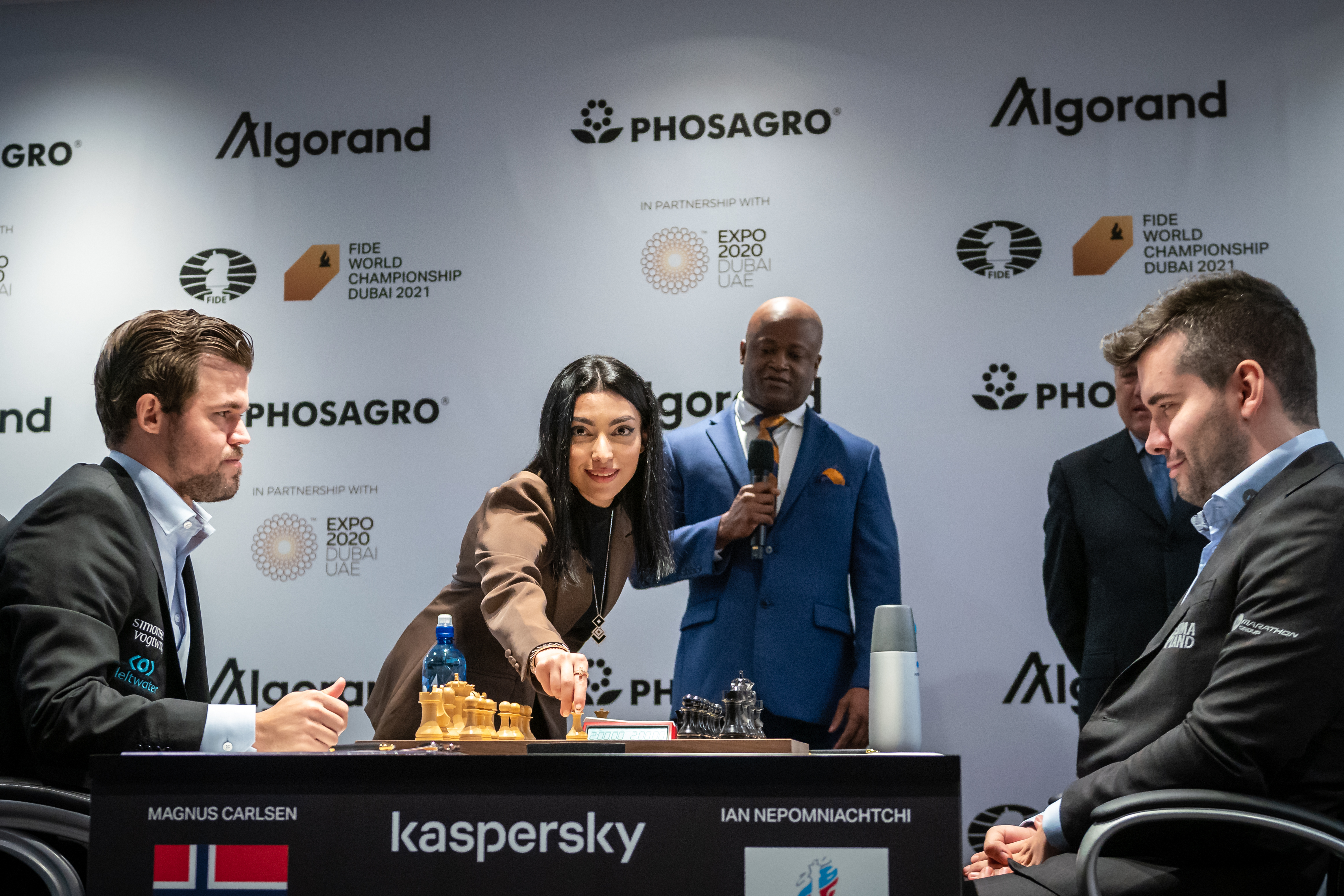 La llegada de ambos y sus respectivos séquitos al Palacio de Congresos de Dubái (DEC), dentro del recinto de la Expo Universal, fue muy significativa. Carlsen, sonriente y relajado. Niepómniashi, muy serio, acompañado por su entrenador, Vladímir Potkin, y su principal analista, el subcampeón del mundo en 2016 Serguéi Kariakin, apodado Ministro de Defensa por su virtuosismo en ese ámbito, con unas gafas negras que le daban aspecto de agente secreto.
