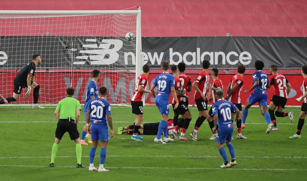 Banega marca de falta el 1-2.Luis Tejido / EFENunca se había visto al Sevilla vestidito de azul por Bilbao. La camiseta blanca había sido sagrada en todas sus visitas a la Catedral. Tal vez cambió por el gafe. Será eso, el gafe de haber perdido todos los partidos que jugó en el campo nuevo del Athletic, y los últimos del antiguo. Más de una década, que ya es perder para un equipo con los posibles del Sevilla, enganchado desde hace tiempo a la planta noble de LaLiga, pero llegaba a San Mamés y se desinflaba frente a uno de sus rivales de toda la vida. Esta vez ganó.Apretó el equipo de Lopetegui en los primeros minutos. Lo hizo con sentido, poniendo en apuros a un Athletic que no sabía por dónde pegaba el aire, aunque el olor a mar les podía haber dado la pista de que llegaba del norte. No es que los hombres de Lopetegui llegaran con peligro al área, pero intimidaban lo suficiente como para meter a los rojiblancos en su campo. La tocaban bien los visitantes, con alegría, pero se diluían al borde del área. Dispararon varias veces pero sin tino. Williams tuvo la mejor del Athletic en el minuto nueve, y replicó Ocampos en la siguiente jugada. La mitad del primer tiempo fue del Sevilla, que en un centro de Navas desde la derecha tuvo su mejor opción, pero remató Suso algo forzado y el balón se le fue alto.El Athletic le fue cogiendo el tono al partido según pasaba el tiempo, aunque sufrió un grave contratiempo con la lesión de Yuri, el mejor tras el regreso de la competición. Perdía profundidad el equipo de Garitano por su banda, aunque desde allí llegó el gol, pocos minutos después, en una apertura a Sancet, que dejó en corto para Vesga. Su centro cruzó el área para que Capa, camuflado detrás de Reguilón, la pusiera lejos del alcance de Bono, titular por lesión de Vaclik.El Sevilla perdió pie desde el gol y el Athletic se llenó de energía. El último cuarto de hora se jugó en campo visitante y los bilbaínos pudieron alargar las distancias en el descuento, en una pelota que le cayó a Muniain en el área pequeña. El remate, deficiente, se marchó fuera.Con el resultado en contra, el Sevilla tardó en encontrar su sitio en el campo, porque tras el descanso fue el Athletic quien tomó la iniciativa y pudo anotar en un remate de Córdoba que atrapó Bono. Poco a poco, sin embargo, los visitantes, que no tenían otro remedio, se lanzaron al asalto del área de Unai Simón, que respondió con un par de paradas descomunales a remates de Suso primero y Ocampos después.Fue, sin embargo, la apuesta de Lopetegui por De Jong y, sobre todo, por Munir, la que transformó totalmente el panorama. Cinco minutos después de los cambios, el segundo de ellos provocó una falta al borde del área que Banega convirtió en el empate. Casi sin tiempo para encajar el golpe, un centro de Banega lo remató de cabeza Munir, libre de marca para poner por delante al Sevilla. El plan le funcionó al entrenador sevillista. Su equipo ganó peso en ataque justo cuando comenzaba el declive físico del Athletic, que en un suspiro se veía por detrás en el marcador. Agotaron los cambios los rojiblancos, tratando de poner dinamita en el campo, con Ibai, Kodro y Villalibre, pero se trataba ya de subir una pendiente frente a un equipo rocoso en el que Ocampos, retirado en el minuto 88, siguió siendo el faro que iluminaba todas las acciones de su equipo.Después de nueve temporadas consecutivas saliendo derrotado de la Catedral, el Sevilla, vestido de azul, volvió a llevarse los tres puntos, que son oro molido de cara a sus aspiraciones de jugar la Champions la temporada próxima. Las del Athletic, que busca la Europa League, se diluyeron cuando Munir ingresó en el césped y conectó con Banega. La camiseta era por el gafe, sí.