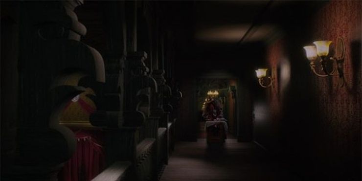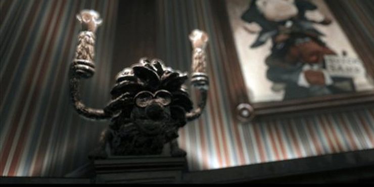 Aunque Sam Eagle aparece como un personaje completo en la escena del salón de baile, esta pequeña y divertida elección estética es una de esas características de diseño que realmente vende el hecho de que esta es la mansión de los Muppet y no la casa encantada de Disney solo. Uno de los muchos Muppets que aparecen en la decoración de la mansión, el perfil puntiagudo de Sam encaja perfectamente en el pasillo sin fin.