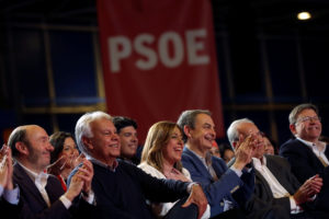 El exlíder del PSOE, Alfredo Pérez Rubalcaba, el exprimer ministro español Felipe González, la líder de los socialistas andaluces Susana Díaz, el exprimer ministro español José Luis Rodríguez Zapatero, el miembro del partido socialista Alfonso Guerra y el miembro del partido socialista Ximo Puig (Foto: REUTERS / Susana Vera)