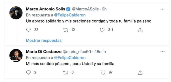 El ex presidente Vicente Fox; el cantante Marco Antonio Solís; y Mario Di Constanzo, entre otros, le enviaron sus condolencias: