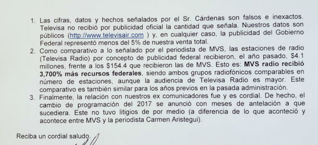 En una carta dirigida al diario El Universal, por la columna que ahí publicó el locutor Luis Cárdenas, Televisa afirmó que “las cifras, datos y hechos señalados” son “falsos e inexactos” pues esa empresa “no recibió por publicidad oficial la cantidad que señala” y “en cualquier caso, la publicidad del gobierno federal representó menos del 5% de nuestra venta total”.