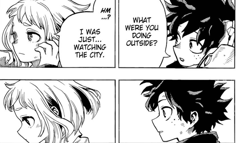 Sin mencionar que esta no es la primera vez que Deku y Uraraka tienen una conversación sincera en el mismo lugar con vista a la ciudad. Oportunamente, los dos también hablaron sobre Toga y Shigaraki en el capítulo 342 y, aunque no confesaron sus sentimientos en ese momento, parece que el próximo capítulo finalmente los verá dar el paso, estableciendo un hermoso paralelo entre los dos momentos.