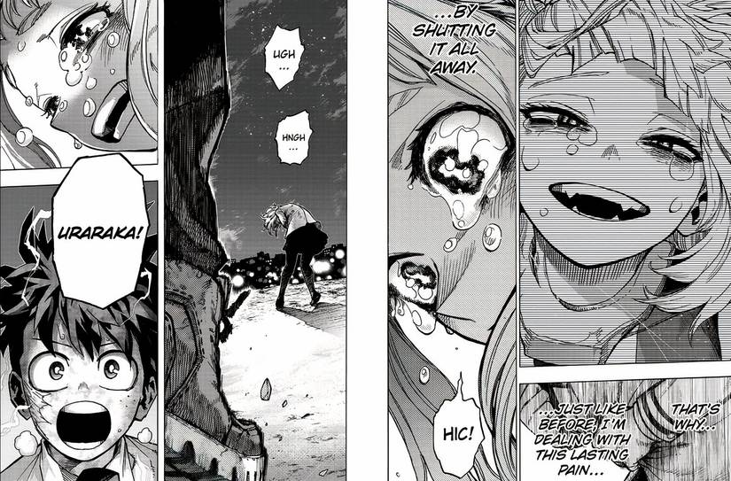Capítulo #428 de Mi academia de héroe revela que Uraraka aún no puede superar la guerra final y aún está plagada de dolorosos recuerdos de su batalla final contra Toga. El capítulo ve Uraraka finalmente rompe a llorar cuando Deku la encuentra y la llama instantáneamente. Preparando el escenario para que los dos finalmente hablen sobre sus sentimientos. y finalmente obtienen su resolución romántica justo antes de que termine la serie.