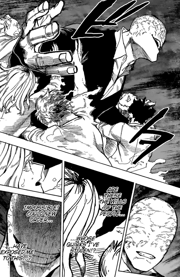 Star and Stripe llegó a Japón después de que el país cayera en el caos debido a las acciones de All For One y Shigaraki. Star y Shigaraki inmediatamente lucharon entre sí, y el héroe estadounidense cayó tristemente en la batalla. Sin embargo, con su último aliento, estableció una regla final: que New Order se rebelaría contra otras peculiaridades. Una vez absorbido por Shigaraki, New Order comienza a destruir las otras peculiaridades contenidas en All For One, causando un gran daño antes de que Tomura se deshaga de él. Parece que New Order ha terminado su trabajo, eliminando muchas peculiaridades de All For One y dañando a Tomura lo suficiente como para darles a los otros héroes tiempo para prepararse para la batalla final, pero el capítulo 355 revela que Star and Stripe hizo mucho más que eso. El cuerpo principal de All For One sufre las secuelas del ataque, que sacó a la luz las “voluntades” de las personas de las que absorbió las peculiaridades, haciéndolas rebeldes y exponiendo a All For One al ataque de los héroes.