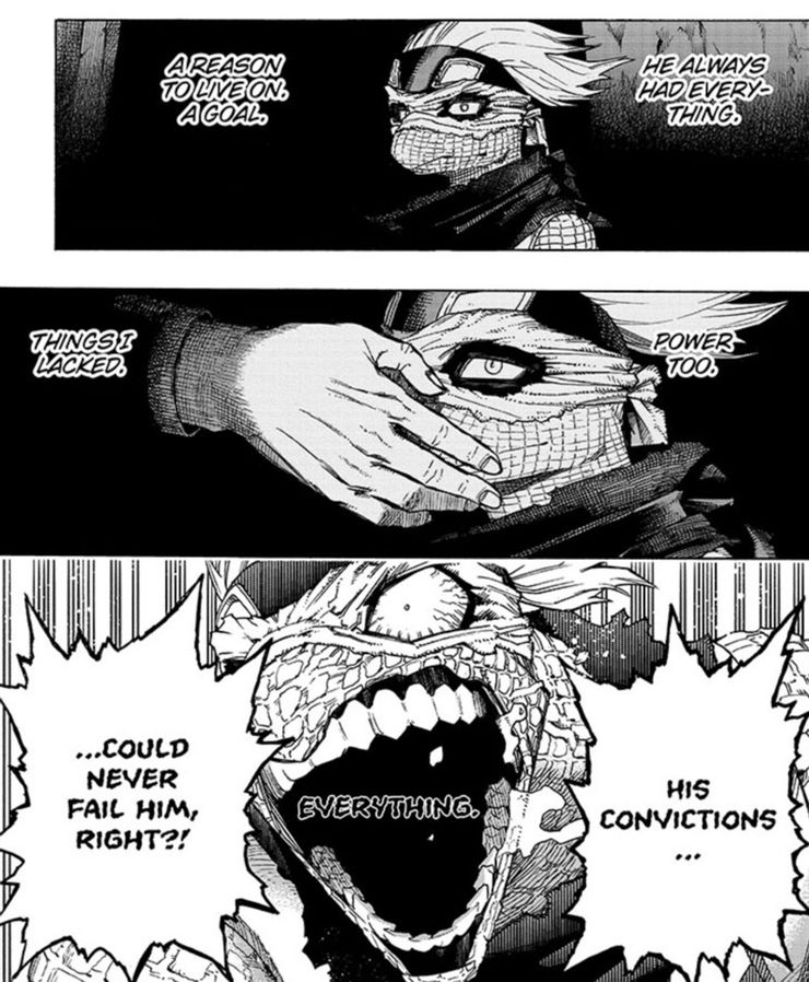 Pero en el capítulo 353, el mangaka Horikoshi logra lo imposible al capturar efectivamente la angustia de su villano menos conocido e impopular, Spinner. Al enterarse de que Dabi ha perdido contra Shoto Todoroki, Spinner no puede creer que la información sea realmente válida e incluso intenta convencerse de que la noticia era solo una “guerra de información”. La lucha de Spinner culmina interna y externamente. Internamente, es incapaz de comprender la posibilidad de que Dabi podría haber perdido ya que Dabi tenía todo, como poder y una razón para vivir, mientras que él mismo no tenía nada. Externamente, se le ve gritando angustiado: “Sus convicciones nunca podrían fallarle, ¿verdad?“