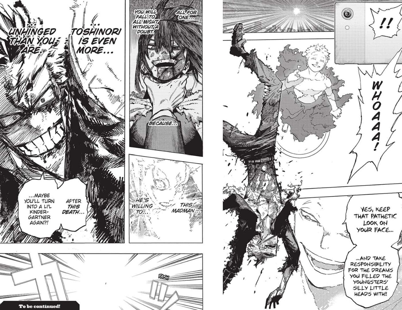 Capítulo #402 de mi héroe academia Vio a All for One finalmente acercarse lo suficiente a Shigaraki para activar su Quirk “Gloop Warp”, pero Shigaraki lo apagó, rechazando la interferencia en su batalla, incluso si estaba destinada a ayudarlo. A pesar de haber infligido probablemente heridas fatales a All Might, All for One no estaba contento con dejar que el ex héroe número uno muriera así. En cambio, All for One optó por arrastrar el cuerpo golpeado de All Might con él, con la plena intención de matar a All Might frente a Midoriya, para intentar destruir su determinación. Esto le dio a All Might la oportunidad de realizar un último ataque aparentemente suicida, detonando un guante inspirado en Bakugo en su brazo para llevarse al villano con él.