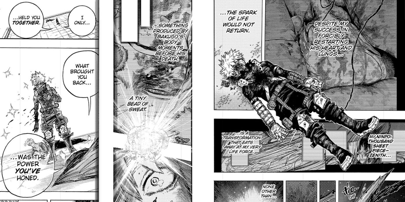 En este capítulo, sin embargo, Edgeshot insiste en que Bakugo y los esfuerzos que hizo para fortalecerse son los realmente responsables de su resurgimiento. Si no hubiera sido por la gota de nitroglicerina, el trabajo de Edgeshot para salvar a Bakugo habría sido en vano. Es un poco irónico, ya que estas cuentas causaron el daño que tuvo a Bakugo tan cerca de la muerte en primer lugar. En cierto modo, el resurgimiento de Bakugo aquí es similar al resurgimiento de Shigaraki en el arco de la Guerra de Liberación Paranormal, ya que ambos se atribuyen a su propio poder, en lugar de a las fuerzas externas que aparentemente fueron responsables de su regreso a la vida.