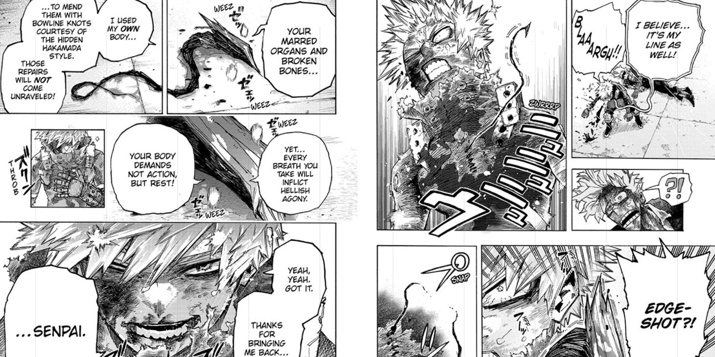 El capítulo 405 revela sorprendentemente que Edgeshot, un héroe que decidió arriesgar su propia vida para salvar la de Bakugo, de hecho todavía estaba vivo, habiendo usado gran parte de la masa de su cuerpo para coser las heridas de Bakugo, tanto internas como externas. Lo pequeño de Edgeshot que queda explica que si bien pudo coser e incluso reiniciar el corazón y los pulmones de Bakugo, todavía faltaba algo y el joven héroe no se levantaba como debería.