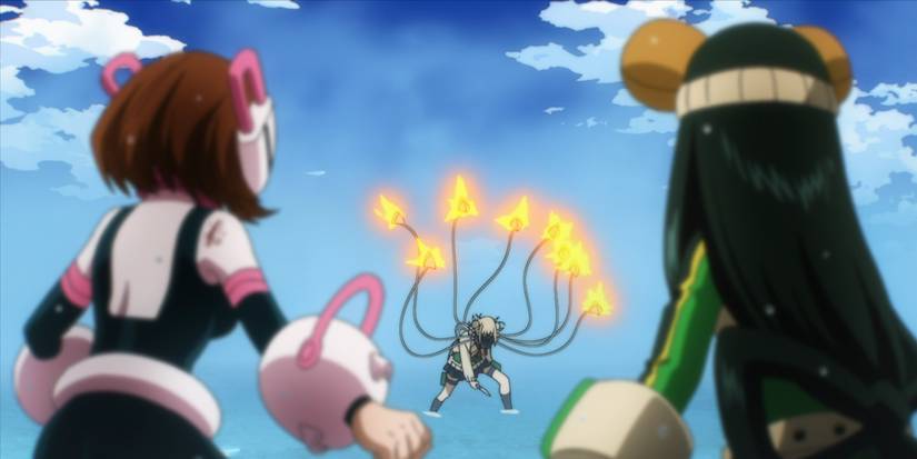 - Deku se enfrenta a Toga, cuyos afectuosos ataques pasan por alto su sentido de peligro.